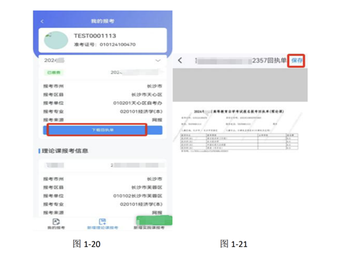 第六步下载回执单缴费完成后,进入APP,显示下图1-18界面中,点击左上角的“<”按钮,返回报考界面,如下图1-19所示,点击“确认”按钮,进入如图1-20所示界面,点击“下载回执单”按钮,进入图1-21所示界面,点击右上角的“保存”按钮即可下载回执单至本手机。