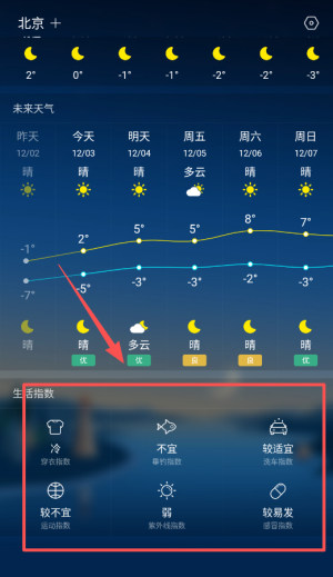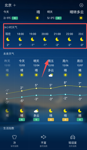 向下滑动可查看逐小时天气变化,包括温度曲线和降水概率,横向滑动则进入未来多日预报页面。