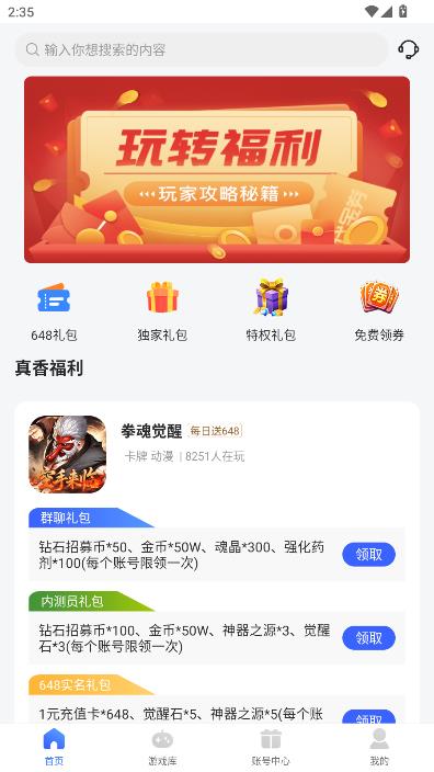 进入首页,可以看到这里提供了多种礼包福利。