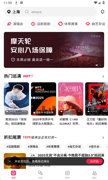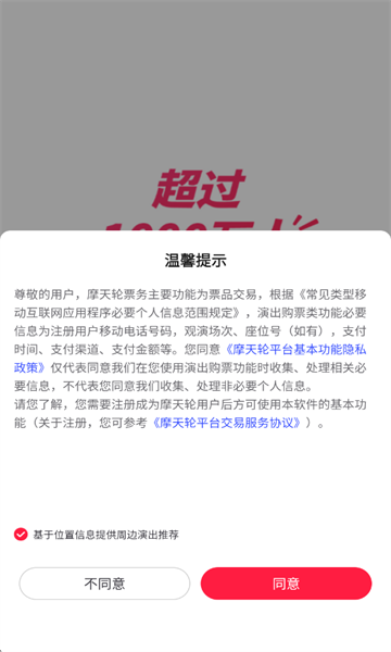 摩天轮app是款聚焦综合性演出赛事票务平台,提供包括电影、演唱会、话剧等多种门票抢购服务,所有票源全来自官方渠道,杜绝虚假、杜绝黄牛,支持通过电子票进厂,对于一些非常热门的赛事会提前预告抢购。