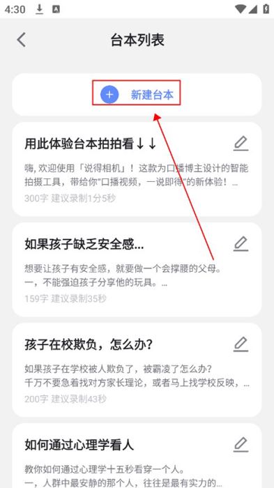 2、在这里可以看到模版台本,用户可以直接使用模版或者点击上方新建台本。