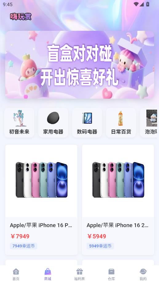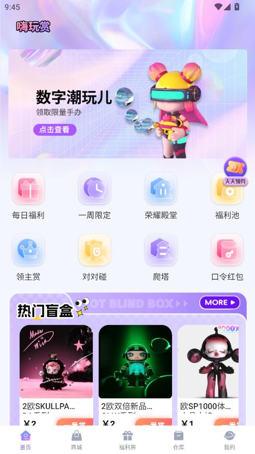 嗨玩赏app是款专注于潮玩商品购物的平台,其主要通过盲盒的形式进行消费,其中可以获取丰富多样的商品,包括各大热门IP联动以及隐藏限定款,所有品质的获奖概率都公开透明,点击有概率触发限量款惊喜哦!