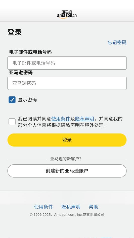输入信息登录即可,如果没有账号可以点击下方创建新的亚马逊账户。