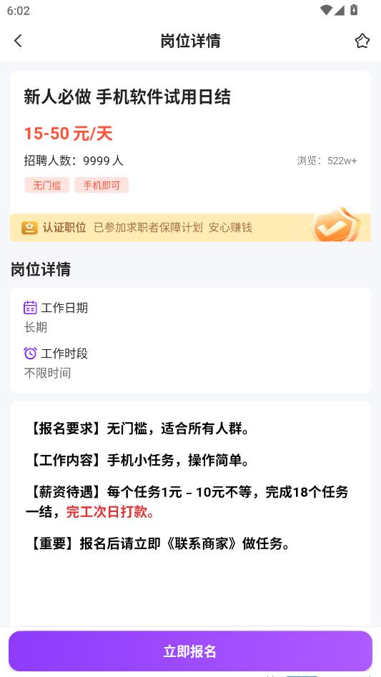 每一个兼职岗位都需要经过审核才可发布到平台,帮你过滤虚假、劣质兼职!