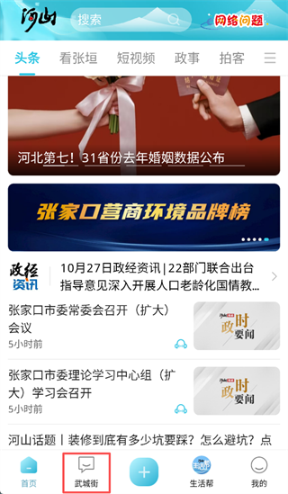 1、打开河山新闻App,点击【武城街】板块或者点击【+号】