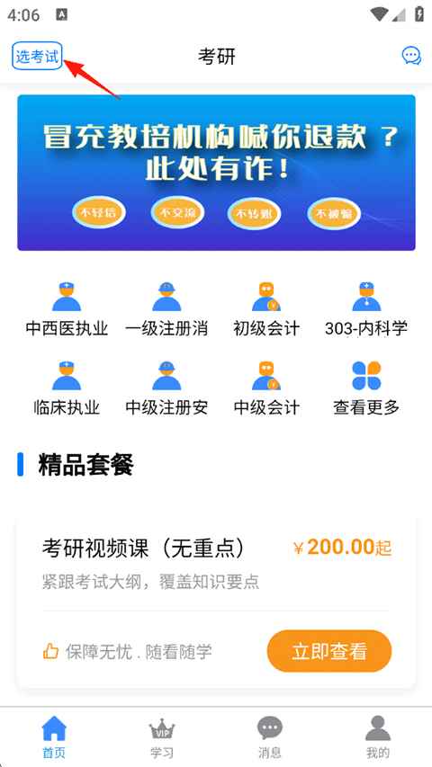 2、进入首页后您也可以在左上角点击选考试切换想要学习的板块分类;