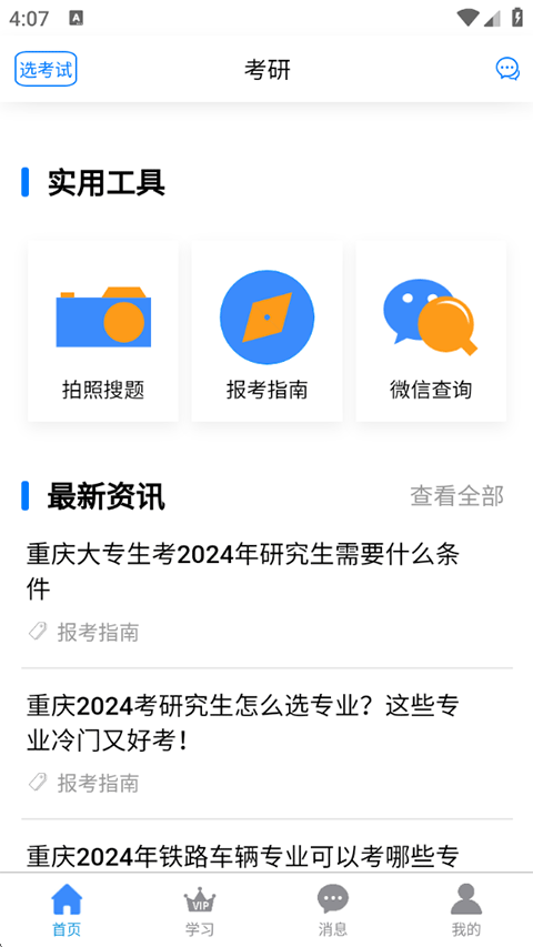 3、在首页下方还有拍照搜题、报考指南和微信查询等实用工具;