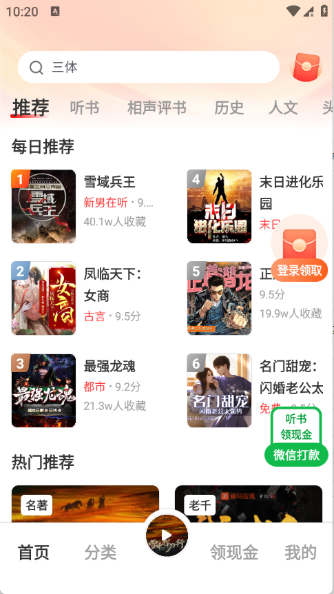鲸鱼畅听是一款丰富的免费听书软件,汇聚了海量正版书籍供大家进行收听,汇聚了悬疑、言情、幻想、历史、都市、文学等等多个分类,让大家可以在在任何时间、任何地点,听自己喜爱的书籍,更能听小说领零花钱,感兴趣就快来下载吧!