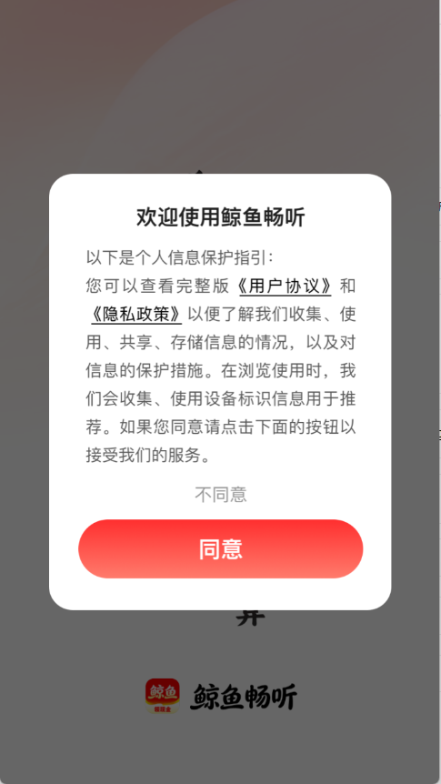 1、用户在本站下载鲸鱼畅听app,点击同意。
