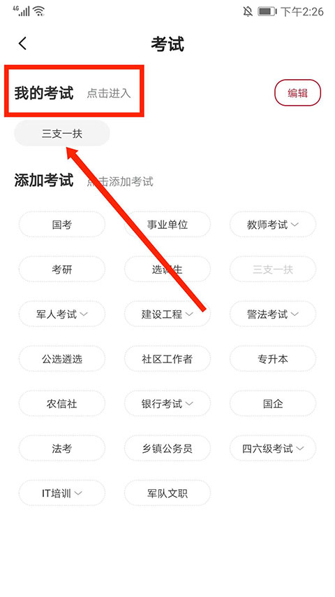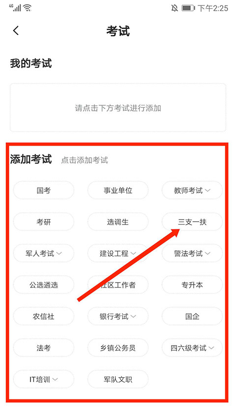 2、进入添加考试界面,选择需要的考试类型,这里以“三支一扶”为例,