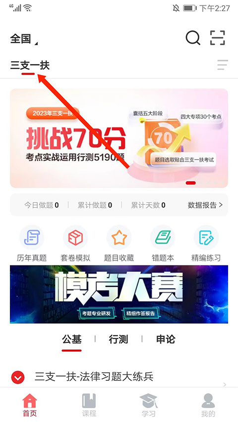 3、选择完成后,在我的考试点击进入栏目,选择“三支一扶”选项,