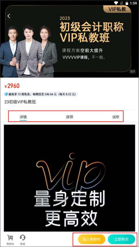 2、在课程的详情页面中了解讲师以及课程的主要内容,点击下方的加入购物车或立即购买进入的课程选择页面。