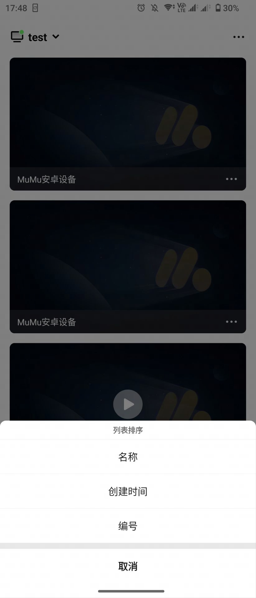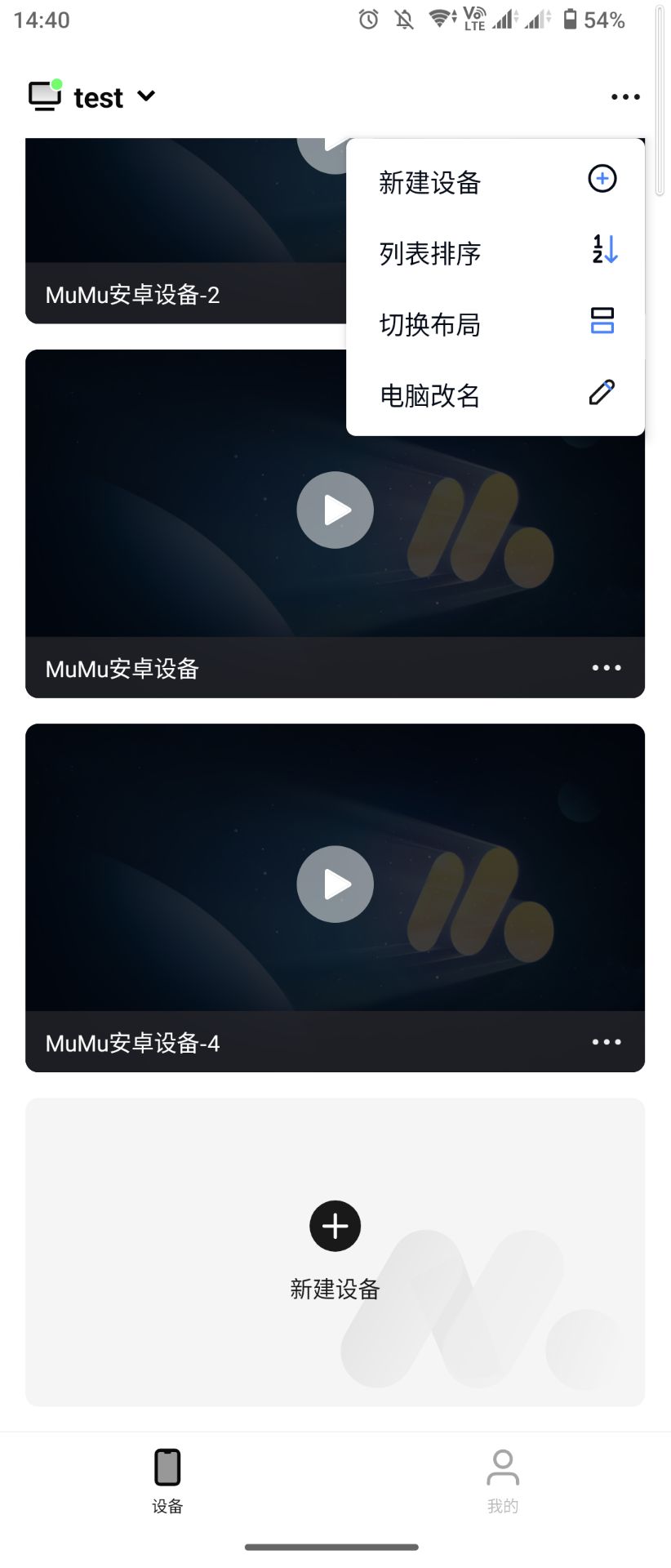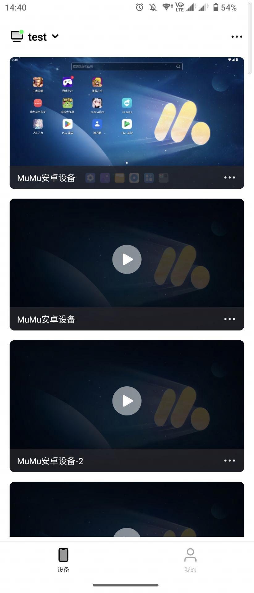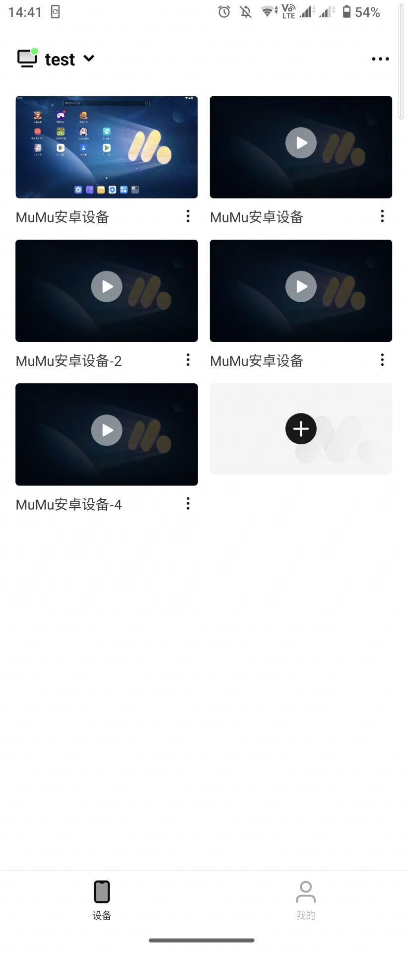 双端登录同一账号后,进入移动端掌上MuMu界面进行远控操作,连接完成后即可进入以下界面,直接看到电脑端上已有的安卓设备。