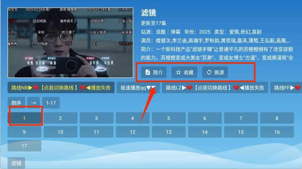 3、播放页支持查看详情与收藏,可切换片源与选择剧集进行观看。