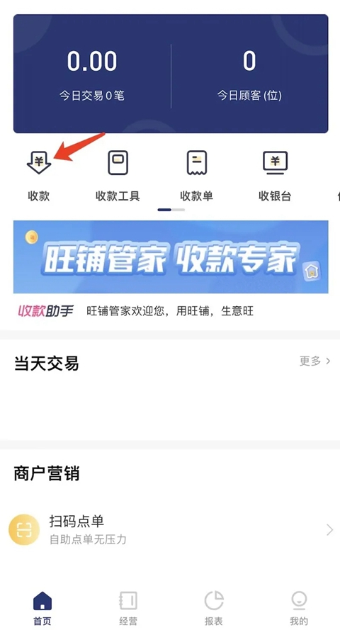 打开邮易付管家APP,登录账号,点击进入首页【收款】板块。