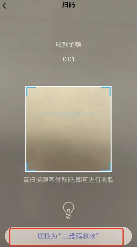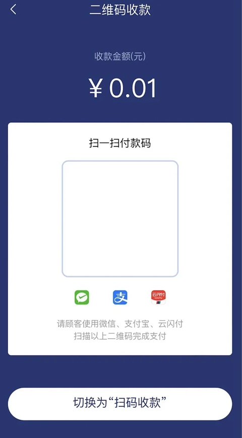 点击【收款】后,对消费者的微信/支付宝/云闪付付款二维码进行扫码收款。也可以点击下方【切换为“二维码收款”】。