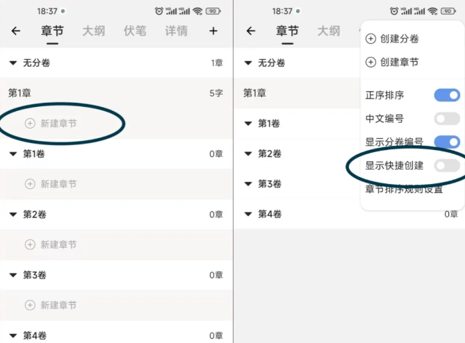 二、添加快速创建和章节功能。可以隐藏和显示快速创建功能。