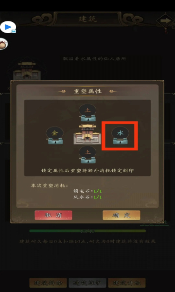 调整建筑属性:建筑羁绊属性一开始都是随机生成,想刷新属性可以使用道具风水石(地源堂二层和天源堂一层购买,每天刷新)重塑,再配合使用锁宅石(天源堂一层)