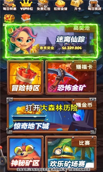大森林历险是款休闲闯关手游,它为用户提供了多种玩法模式,包括惊奇地下城、神秘矿区、换了矿场赛等,每种玩法都有着各自的特色,能够满足不同玩家的喜好,通过完成任务或者通过可以获取相应的红包奖励。