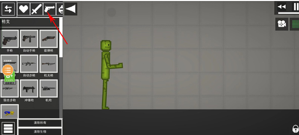 胳膊停住在空中停住之后,我们需要在左上角选择枪械图标去选择枪械;
