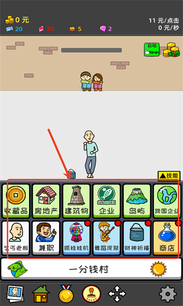 1、在一分钱村之中,包含了各种建筑,你可以选择自己需要的场所去增加自己的属性点或者其他的东西。