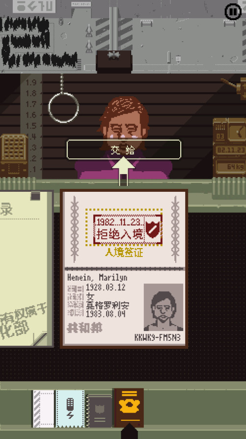 4、证件最多有三个,护照、入境文件和工作证,记住当前规则所需要的证件,如果证件缺少一样,在检查模式下加亮放有证件的桌子和规则中某个条件,然后拒签。