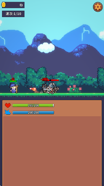 4:进入战斗界面,角色自动攻击怪物,界面显示生命值、魔法值和当前波次(如波次1/10),需注意躲避怪物攻击,确保生存。