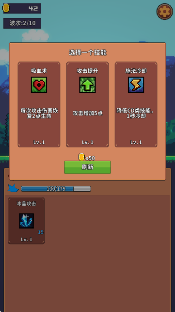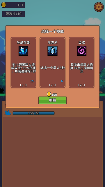 5:战斗过程中会出现技能选择界面,可从“冰晶攻击”“冰冻术”“汲取”中选择一个技能,提升战斗能力,也可花费金币“刷新”技能列表。
